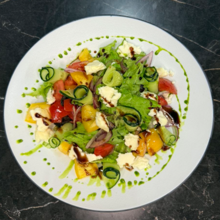 (Свежие томаты и огурцы болгарский перец оливки и фета заправленные необычной цитрусовой заправкой)
