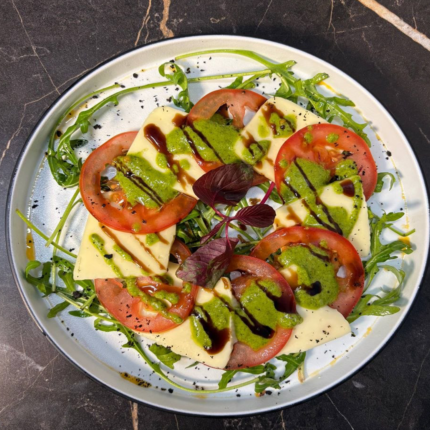 (Салат с томатами и сыром — свежая руккола слепые томаты и нежный сыр под ароматным соусом песто и бальзамическим кремом)