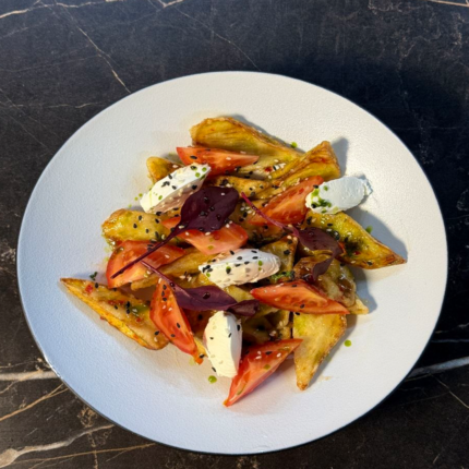 (Золотистые баклажаны с хрустящей корочкой сочные томаты крем чиз и пикантный соус)
