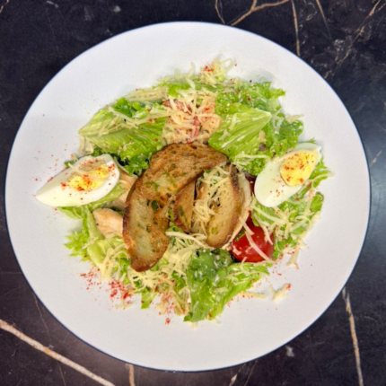 (Сочная курица хрустящие гренки яйцо листья салата айсберг томаты черри и фирменная заправка соус цезарь)